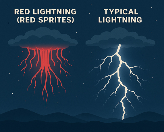 - “Red lightning” is an actual meteorological phenomenon, officially called, “red sprites”. They’re real, they’re rare, and they’re large-scale, high-altitude electrical discharges that occur above thunderstorms. They’re hard to spot and were only officially captured on camera in 1989. They are red in color because the air at high altitudes is thin and mostly composed of nitrogen and oxygen. When a lightning bolt creates an electrical field, it excites the nitrogen and oxygen molecules, and when these molecules release their energy, they do so in a form of light. Nitrogen’s energy emissions are seen as reddish-orange in the color spectrum, and that is why we see these bolts of energy as red.